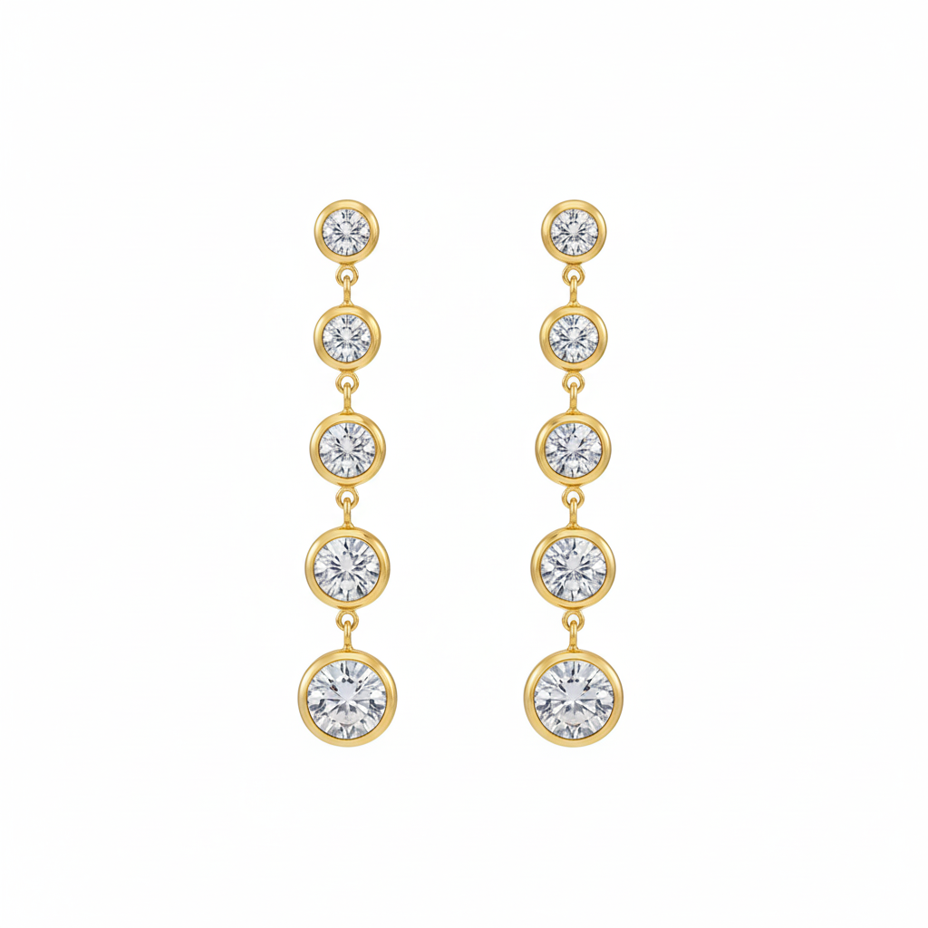 As pedras, encaixadas em aros dourados polidos, aumentam gradualmente do topo para a base, criando um movimento e um brilho intenso que ilumina o rosto.