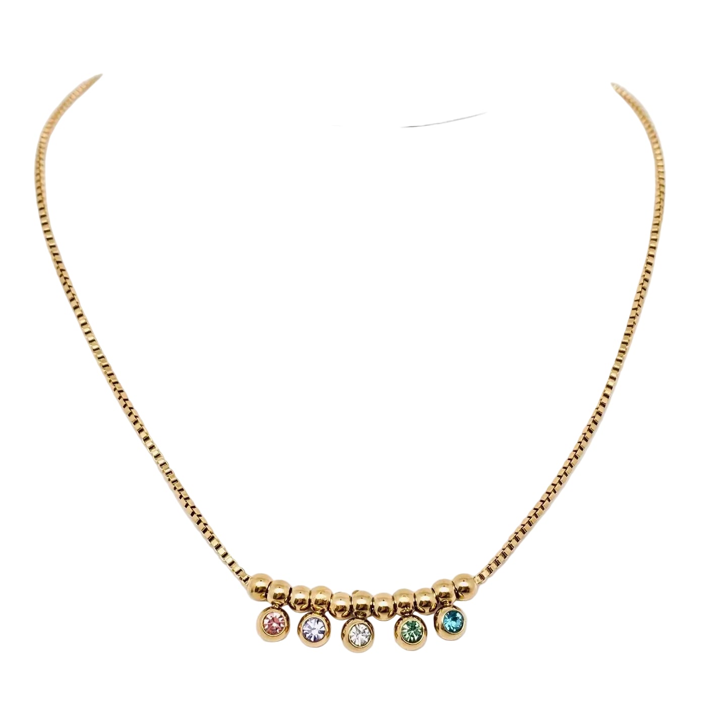 O colar possui uma corrente veneziana (tipo box chain), conhecida por sua elegância, brilho e resistência, toda em acabamento dourado de alto brilho. O destaque fica por conta do pendente fixo, composto por uma fileira de pequenas bolinhas que seguram cinco zircônias cúbicas redondas (pontos de luz). As pedras vêm em cores variadas, como rosa claro, lilás, cristal (branco), verde água e azul, conferindo um charme sutil e personalizado.