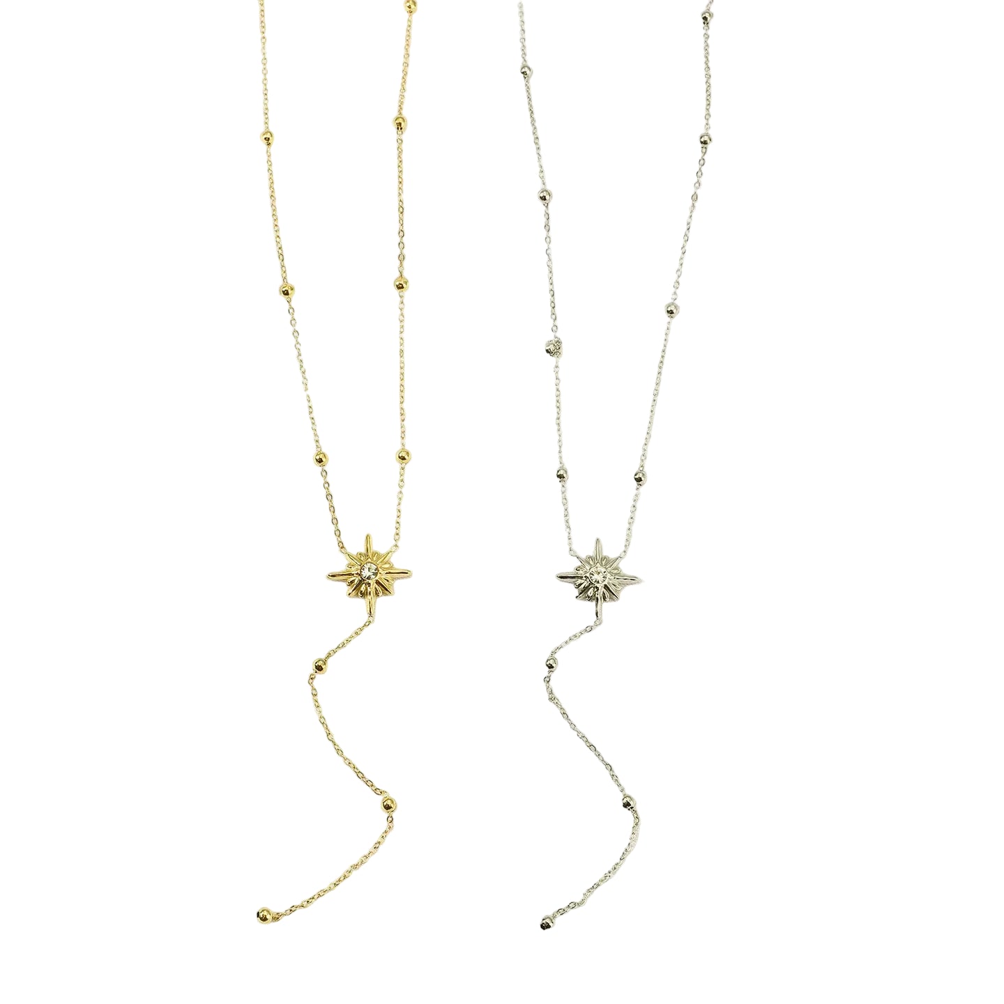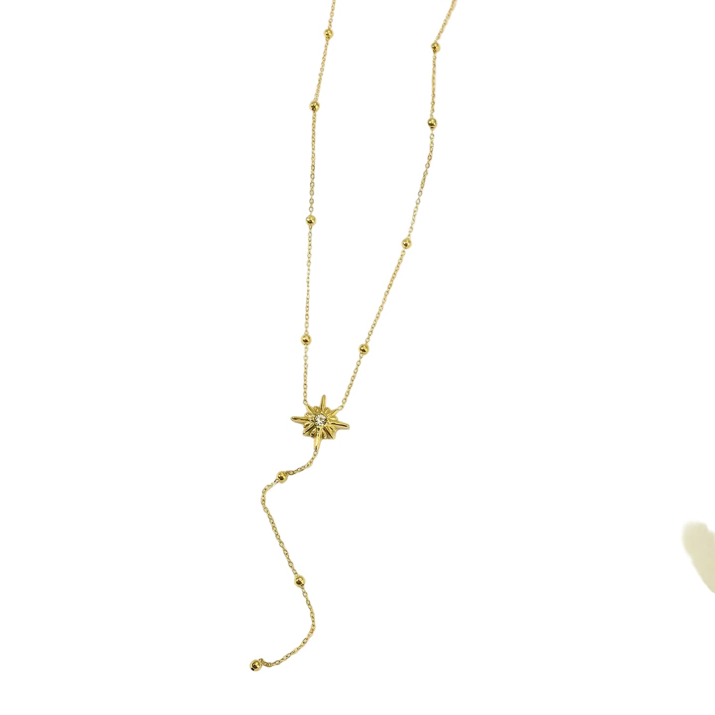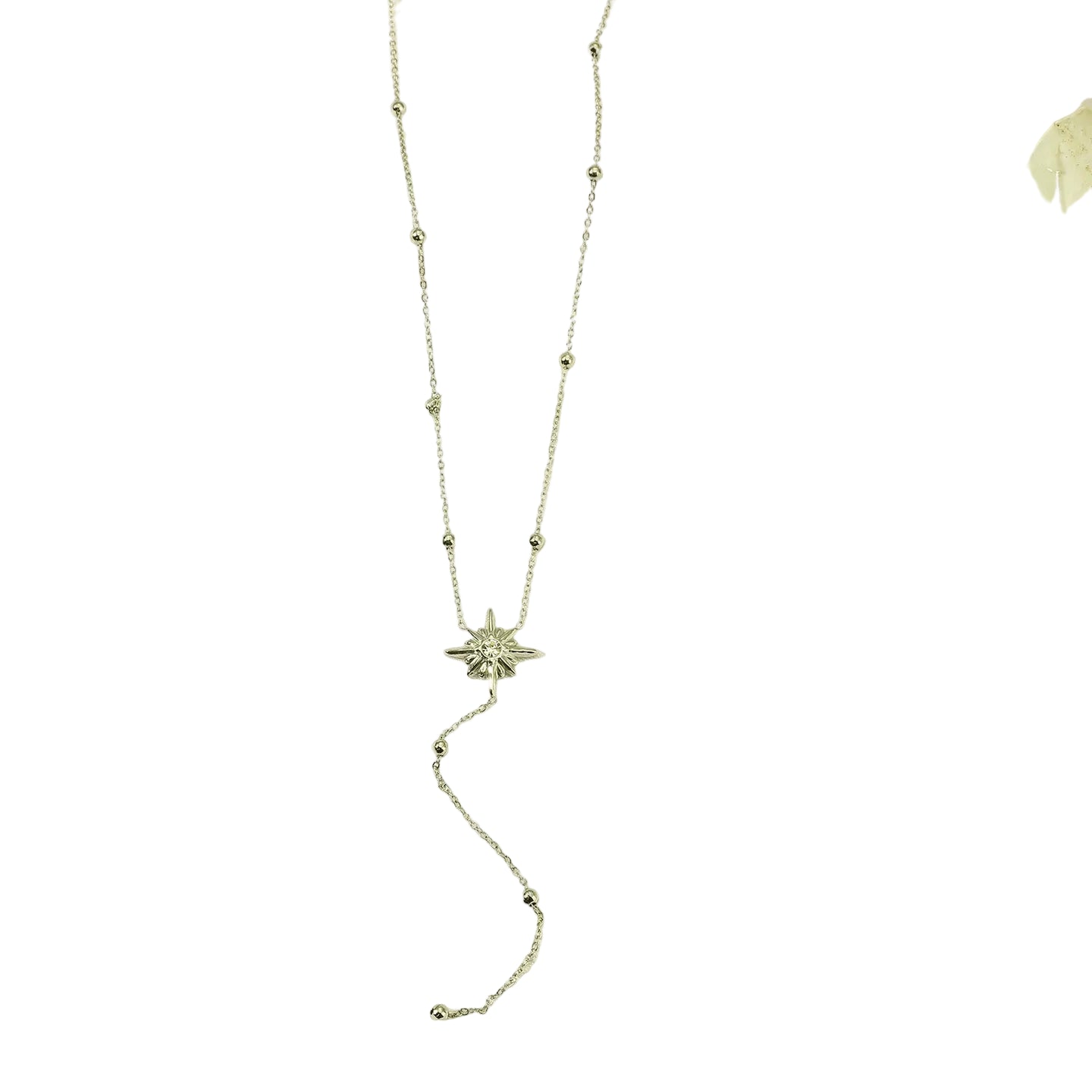 Adicione um toque de elegância celestial ao seu visual com este lindo colar. Com um design alongado, ele apresenta a delicadeza da Estrela do Norte e pequenos cristais que adicionam brilho sutil ao decote.