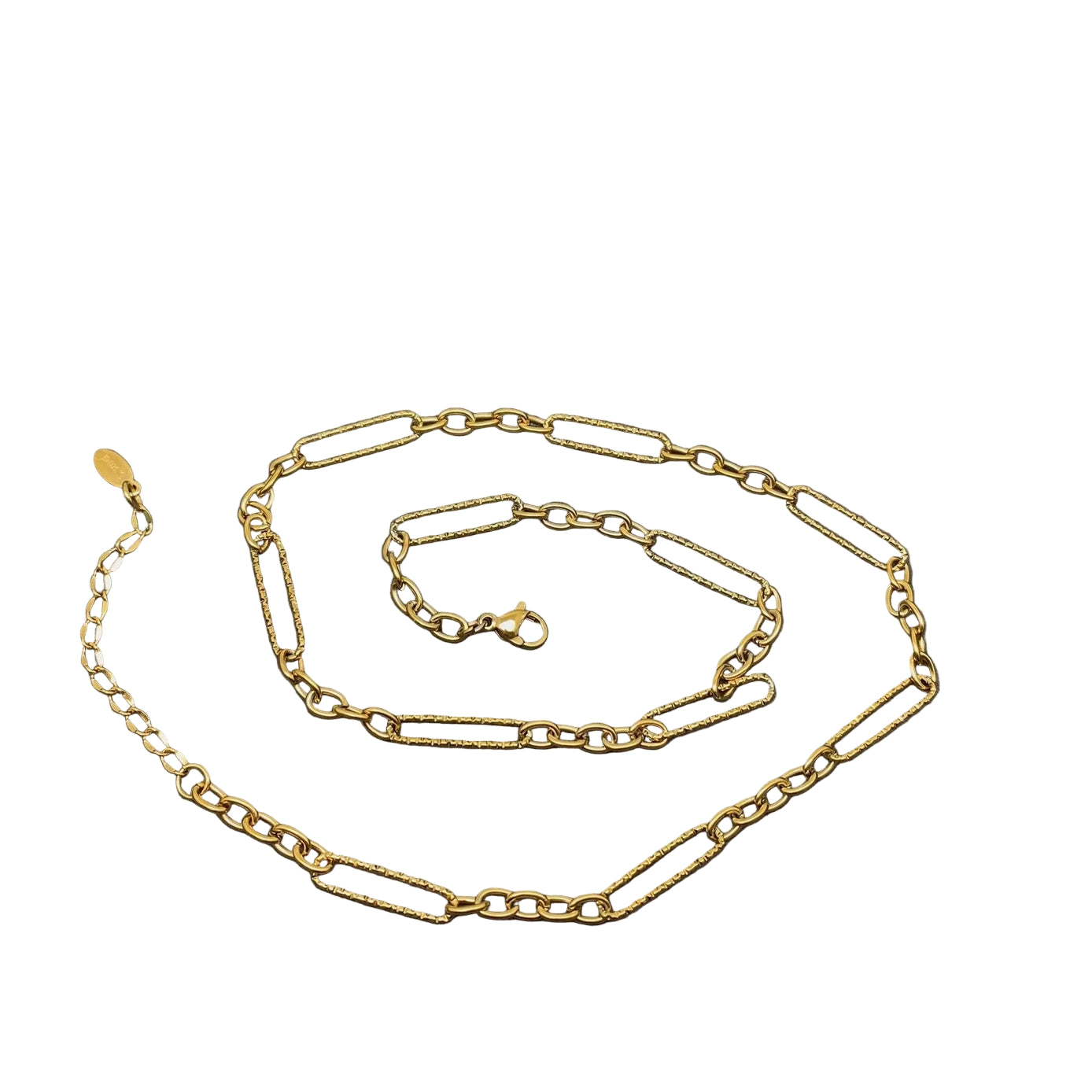 Esta corrente dourada é uma peça statement que está super em alta! O design é caracterizado pela combinação de elos de diferentes formatos e texturas, criando um visual rico e moderno.